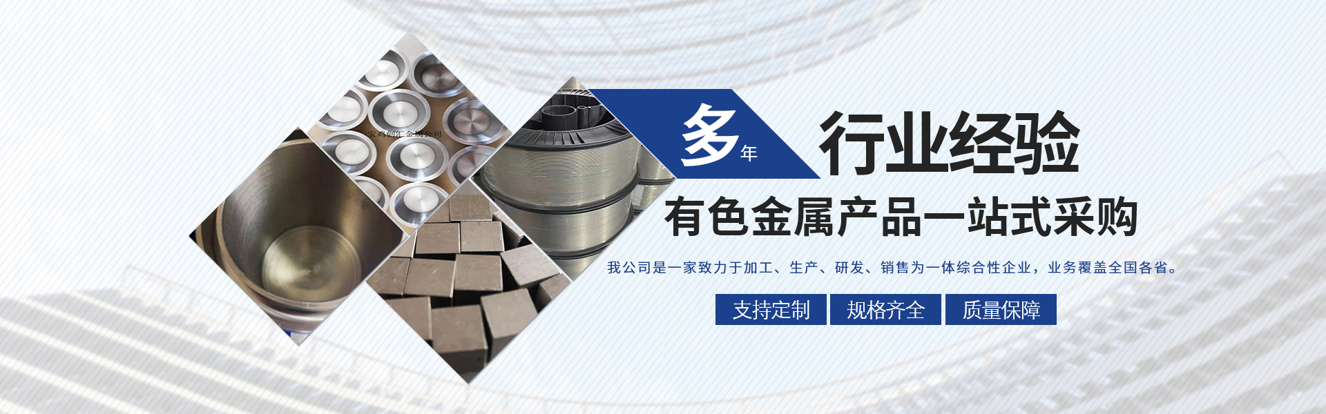 寶雞市創(chuàng)匯金屬材料有限公司,位于有“中國鈦谷”之稱寶雞寶鈦路南段,這里也是國家重點支持和扶持的有色金屬材料資源產(chǎn)業(yè)基地,我司專業(yè)從事鈦、鋯、鉿、鎳鉻、鎢鉬、鉭鈮、合金材料、復(fù)合材料,板、棒、絲、管、箔材等,設(shè)備制造,金屬制品機械加工銷售。